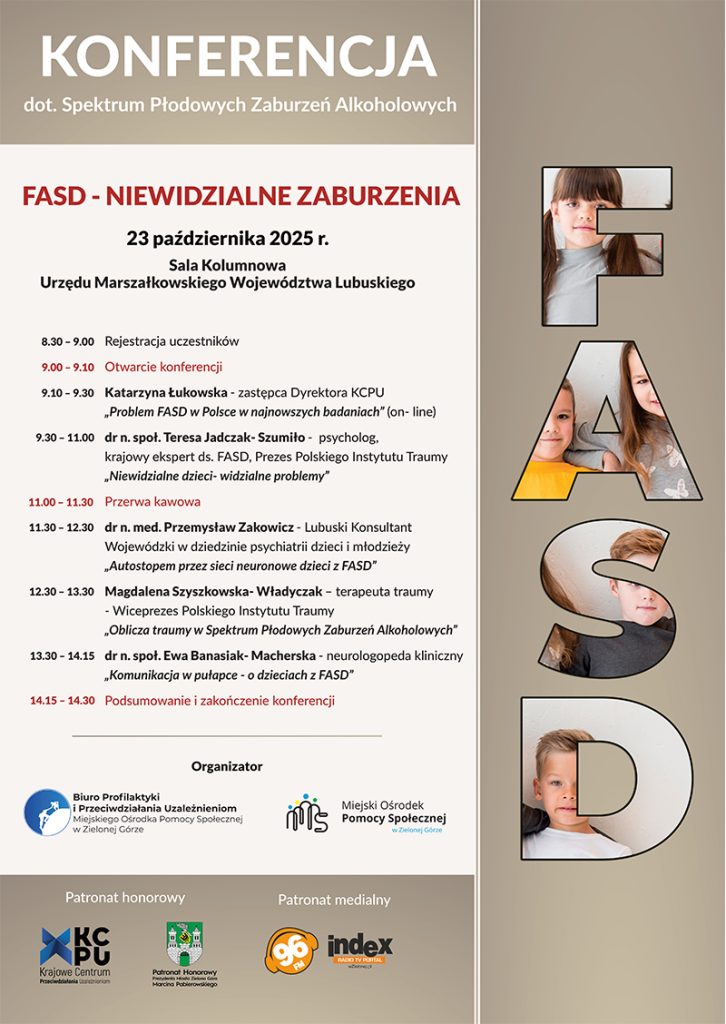 Biuro Profilaktyki i Przeciwdziałania Uzależnieniom MOPS w Zielonej Górze serdecznie zaprasza do udziału w bezpłatnej konferencji dot. Spektrum Płodowych Zaburzeń Alkoholowych pt. „FASD- niewidzialne zaburzenia”, która odbędzie się 23.10 br. w godz. 9.00-14.30 w Sali Kolumnowej Urzędu Marszałkowskiego Województwa Lubuskiego.